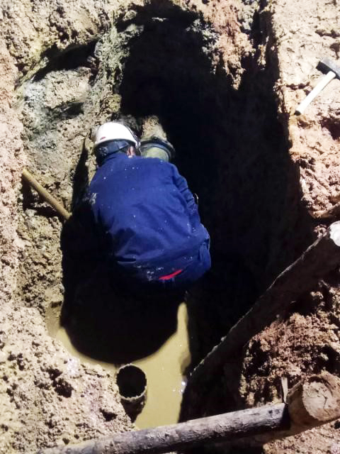 維修一室主管張宏玉現(xiàn)場認真檢查后提出兩種維修方案:一種是使用哈弗接和彎管連接管道,省時省力,但是長期下來,超高水壓會再次導致水管損壞漏水;另一種是挖出鋼管彎頭處進行氧焊割,使聯(lián)盤和下降管平行焊接,大大降低了因高水壓導致該管再次漏水的風險。但是現(xiàn)場維修條件復雜,施工機械根本無法入場協(xié)助開挖,一旦選擇第二種方案,就意味著2.5米深的操作坑只能全部采用人工開挖,費時費力,維修進度會變得非常緩慢。